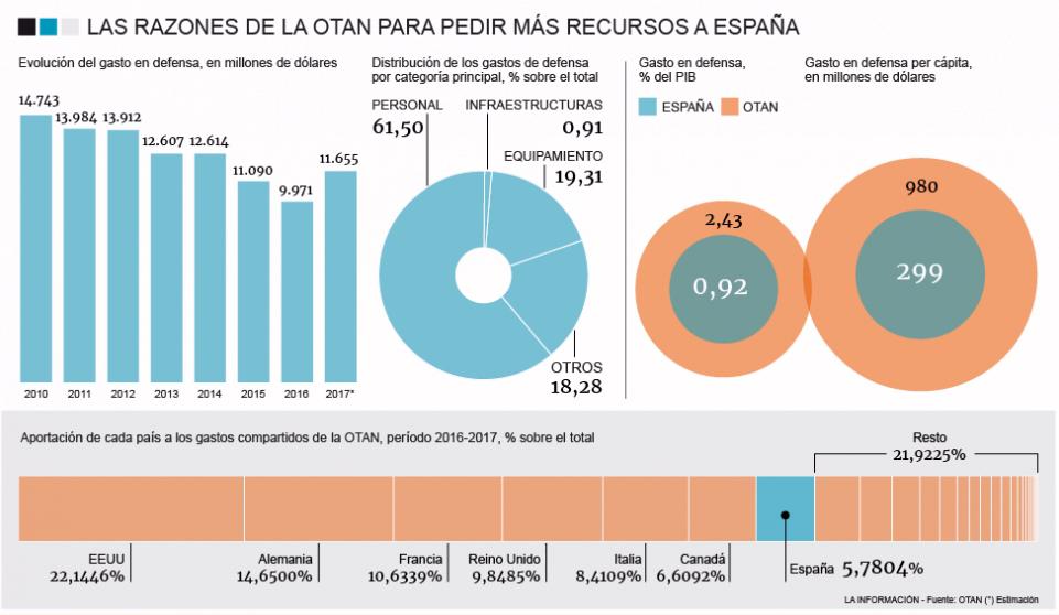 Un país como España, por su situación geoestratégica, dimensiones, historia, industria y peso en Europa no puede permitirse gastar únicamente el 0,93 % del PIB en materia de defensa. Con la llegada al poder del ejecutivo socialista, se ha llegado a temer por algunas inversiones comprometidas por la anterior Ministra de Defensa, pero por lo visto, tras el rapapolvo del Presidente Donald Trump a sus socios de la Alianza Atlántica, el Presidente del Gobierno España ha decidido asumir el compromiso de la Ministra Cospedal de elevar el gasto en defensa hasta el 2% en 2024.