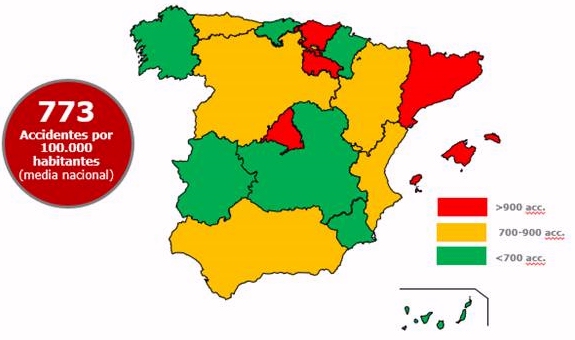 Por Comunidades Autónomas, Cataluña, Baleares y Madrid tienen los índices más altos, debido, entre otros factores, a la mayor penetración del parque motorista urbano y la mayor afluencia de peatones. En el lado opuesto se sitúan Navarra y Castilla-La Mancha, con los índices más bajos.