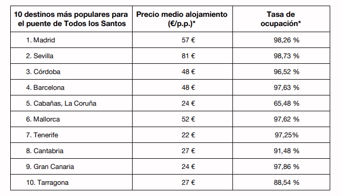 El puente de Todos los Santos, 1 de noviembre, es la oportunidad ideal para disfrutar del comienzo de la estación otoñal. Según datos de HomeToGo, buscador de alquileres vacacionales, este año Madrid encabeza la lista de los destinos más buscados para viajar durante el puente y alcanza una tasa de ocupación del 98,26 %. A la capital le siguen Sevilla, Córdoba, Barcelona y el municipio de Cabañas, en La Coruña, respectivamente.