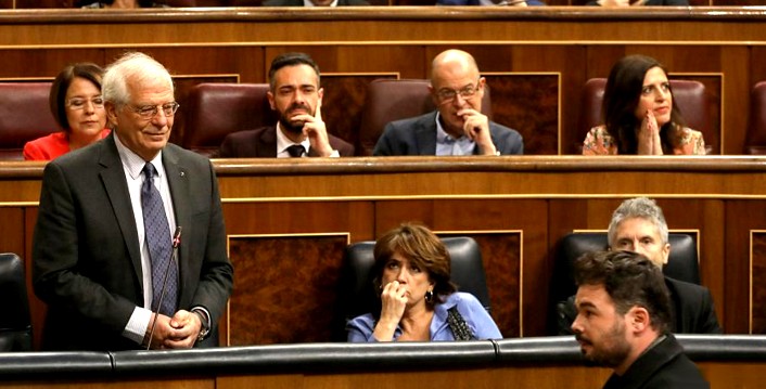 Rufián: “Señor Borrell, si viniera a los plenos se enteraría de lo que estamos hablando, cada vez que el grupo parlamentario de Ciudadanos nos llame golpistas, le recordaremos los tiros que hay en el techo y les diremos fascistas. Dicho esto, dicho esto, señor Borrell, la verdad es que llevo tiempo queriendo decirle esto. Usted, y míreme bien, usted es el ministro más indigno, usted es el ministro más indigno de la historia de la democracia española; y los ha habido muy indignos. Usted, señor Borrell, no es un ministro, usted es un hooligan, usted es un militante de Sociedad Civil Catalana, una vergüenza para su grupo parlamentario, más que nada porque es una organización de extrema derecha...Tres cosas, señor Borrell. La primera, vergüenza. Le debería dar vergüenza decir que compite con nosotros cuando maneja un presupuesto de 1.500 millones de euros respecto a 60. La diferencia entre usted y un ministro de exteriores se llama Raúl Romeva. Dos, vergüenza que usted se mofe de mi compañero Oriol Junqueras mientras se pudría en una cárcel de Madrid y usted se estaba mofando en un mitín del PSC. Le pido que dimita. Muchas gracias.”