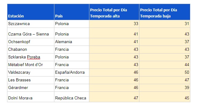 La práctica de los deportes de invierno puede ser una excusa tan buena como cualquier otra para viajar más allá de las fronteras de nuestro país, más aún cuando puede guiarte en la dirección correcta en tu búsqueda de los precios más bajos. Los dos países más destacados en este sentido son Polonia (Szczawnica - 33€, Czarna Góra - 41€ y Szklarska Poreba - 43€) y Francia (Chabanon - 43€, Métabief Mont d'Or - 43€, Les Brasses - 46€ y Gérardmer - 46€), que consiguen colocar 3 y 4 estaciones en el top 10 de las más económicas de Europa, respectivamente. Alemania (Ochsenkopf Fichtelgebirge - 41€) y República Checa (Dolní Morava - 47€) también están representadas en esta clasificación con una estación por país, al igual que España (Valdezcaray - 46€). Con estos precios te va a tocar presumir de esquiador trotamundos.