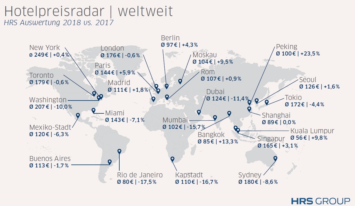 Sobre la evaluación: el informe se basa en todas las reservas de hotel realizadas a través del portal HRS durante el período del 1 de enero al 31 de diciembre de 2018 que no fueron canceladas, siendo consideradas en la encuesta tanto las habitaciones individuales y dobles, con y sin desayuno en los hoteles de las categorías de una a cinco estrellas. Se evaluaron los destinos con un alto volumen de reservas.
