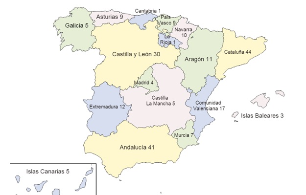 Cataluña, con 44 adjudicaciones y Andalucía, con 41, son las dos comunidades autónomas con más ayuntamiento adjudicatarios. Le siguen Castilla y LKeón con 30, Valencia con 17, Extremadura con 12, Aragón y la Rioja con 11, Navarra con 10, Asturias y País Vasco con 9, Murcia con 7, Galicia, Canarias y Castilla la Mancha con 5, Madrid con 4, Baleares con 3, y Cantabria con 1.