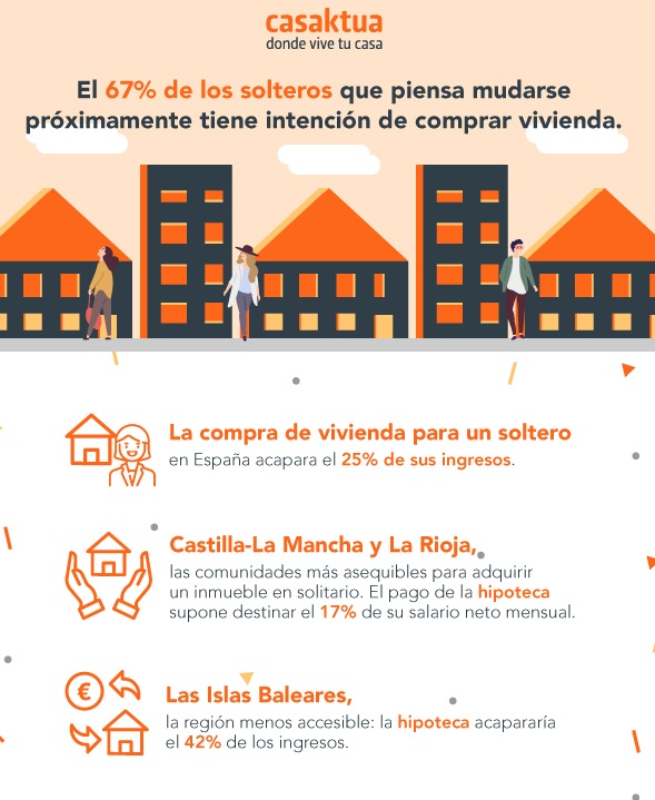 Tomando como base este escenario, el portal inmobiliario Casaktua.com ha analizado, con motivo del Día del Soltero (13 de febrero), en qué comunidad autónoma es más factible que una persona soltera pueda adquirir un inmueble. La comparativa revela que Castilla - La Mancha y La Rioja son las regiones donde los solteros pueden comprar una vivienda de una forma más cómoda al tener que destinar a la hipoteca una media del 17% de sus ingresos.