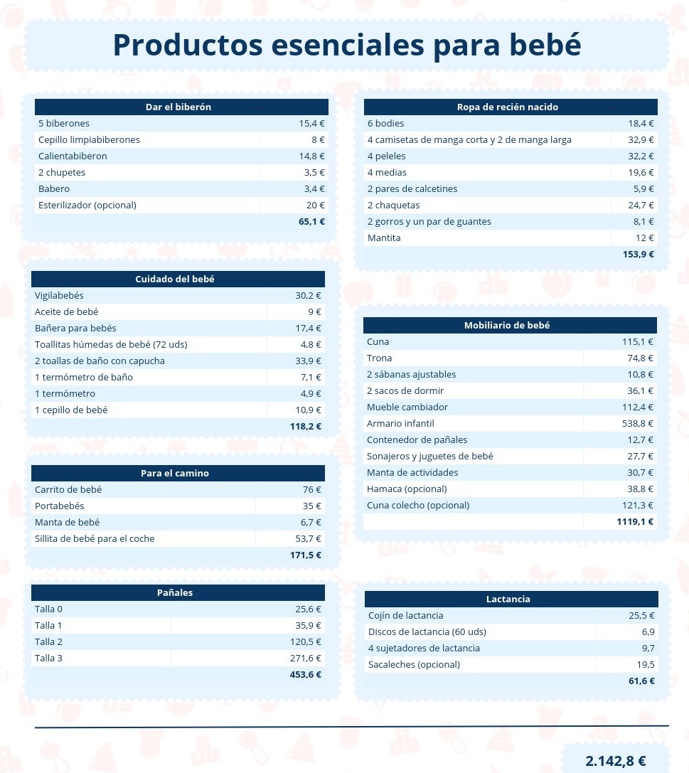 Las categorías que han subido más de precio en los últimos dos años son los productos de lactancia y el mobiliario. Los productos de lactancia, que incluyen cojines de lactancia, discos de lactancia, sujetadores de lactancia y sacaleches, han subido un 62 %. En cuanto el mobiliario, el coste incluiría la cuna, sábanas, sacos para dormir, la trona, el mueble cambiador, un armario infantil, la cuna de colecho, un contenedor de pañales, la hamaca, una manta de actividades, el sonajero y juguetes de bebé. Estos elementos han experimentado una subida de un 46,3 % de media frente a 2016, alcanzando los 1.119,1 €.