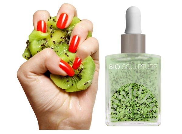 La firma sudafricana Bio Sculpture incluye en su nueva línea ETHOS un exfoliante especial con aroma de kiwi (Ethos Kiwi Scrub) que ayuda a eliminar las células muertas de la uña, un cítrico usado habitualmente en el mundo de la belleza para innumerables tratamientos, sobre todo en mascarillas y también como base de exfoliantes naturales. Rico en sales minerales, antioxidantes, carotenos, flavonoides y vitamina C, contiene además raíz de ginseng, polvo de semillas de fruta de la pasión y almendras dulces.