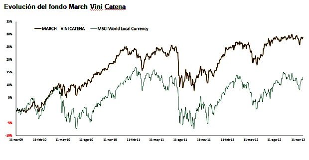 March Vini Catena, el primer fondo de inversión que invierte en compañías cotizadas que participan en la cadena de valor del vino, acumula un 28,85% de rentabilidad (a 30 de noviembre de 2012) en su tercer año de funcionamiento y un patrimonio de más de 53 millones de euros en España y Luxemburgo. Asimismo, en lo que va de año el fondo ha alcanzado una rentabilidad de 10,24%.