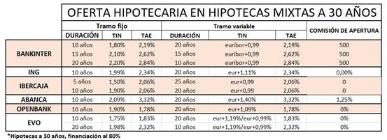 En la actualidad, los tipos de interés de las hipotecas mixtas a 30 años rondan entre el 1,50% y el 2,20% en el tramo fijo y entre el 0,99% y el 1,40% en el tramo variable. Dentro de la oferta bancaria se pueden encontrar muchas diferencias en el TIN de la parte fija en función de la duración de este. Por ejemplo, en el caso de ING el periodo fijo será siempre de 10 años con un TIN del 1,99% y una TAE del 2,34%. En la parte variable, el tipo de interés es de euríbor +1,11% y la TAE del 2,34%.