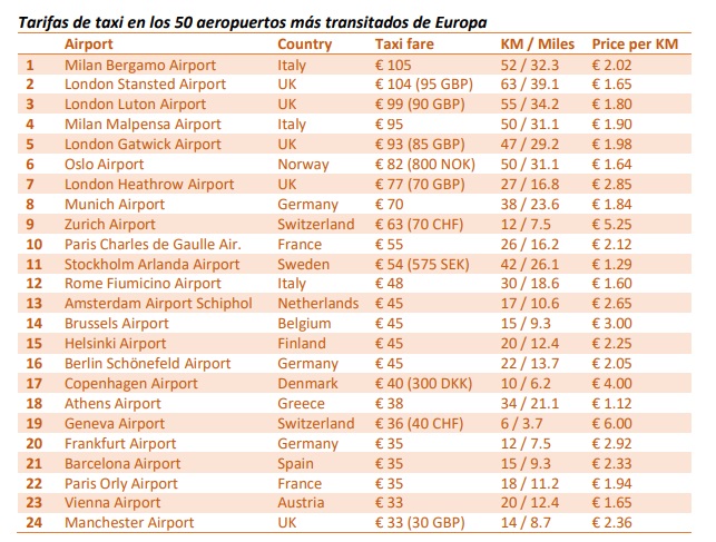 Coger un taxi desde el aeropuerto de llegada al destino final en algunos aeropuertos resulta caro. En los aeropuertos de Londres (Stansted, Luton, Gatwick) y de Milán (Bérgamo, Malpensa), los viajeros tienen que tener en cuenta que un trayecto en taxi hasta el centro de la ciudad puede costar 100 euros. Esta cantidad es 10 veces superior al precio de los aeropuertos de Bucarest y Varsovia. En Europa, los viajeros pagan una media de 40 euros por un trayecto en taxi desde el aeropuerto al centro de la ciudad, según un estudio realizado por el sitio web de viajes Aeropuertoinfo.com en colaboración con AirMundo.com.