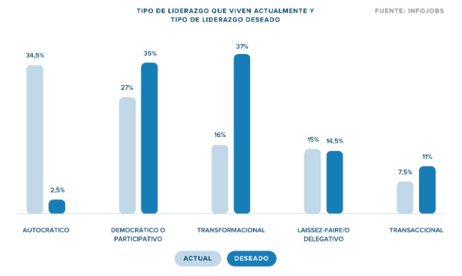 Por el contrario, a la hora de hablar sobre el tipo de liderazgo que desearían los empleados, el modelo autocrático es el menos nombrado: solo al 2,5% de los españoles les gustaría vivir un estilo de liderazgo autocrático en su empresa.