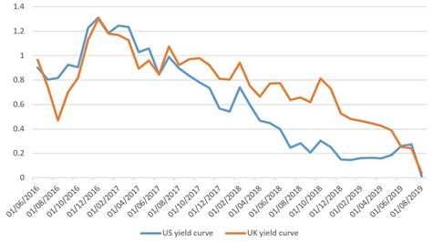 El siguiente gráfico muestra la diferencia entre el rendimiento de la deuda pública a 2 y 10 años en EE.UU. y Reino Unido, lo que crea la curva de rendimiento. Las cifras que se muestran son de final de sesión. La curva de rendimiento de Reino Unido se invirtió durante el 14 de agosto de 2019.