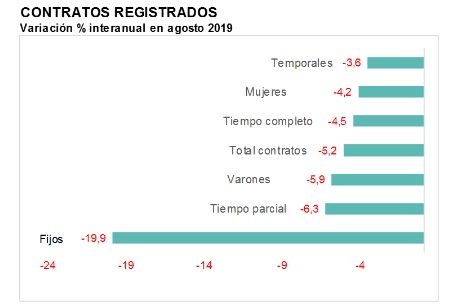 Ha disminuido el número de contratos temporales y el de indefinidos. Los contratos indefinidos tienen un descenso interanual total de 19,9%, cayendo tanto los de tiempo completo como los de jornada parcial (-18,7% y -21,7% interanual, respectivamente). Es el séptimo mes consecutivo en que los contratos indefinidos muestran una caída interanual. Por su parte, los contratos temporales han caído un 3,6% en comparación con agosto de 2018. Se han reducido tanto los contratos a tiempo parcial como completo (-4,4% y -3,1% interanual, respectivamente).