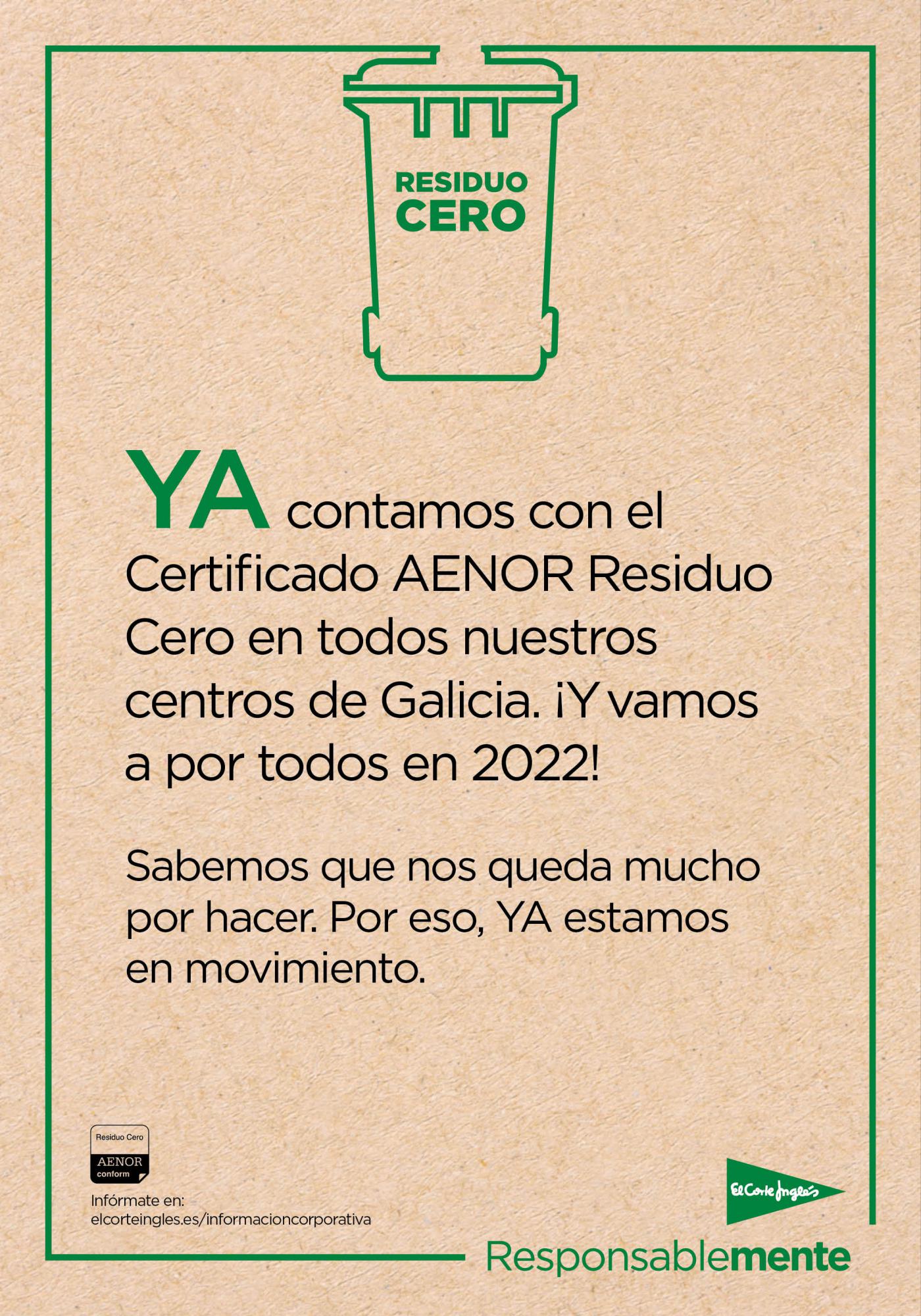 En esta línea, El Corte Inglés ya tiene en marcha diversas iniciativas: como el objetivo de alcanzar la certificación Residuo Cero en todos sus centros en 2022; el Grupo consume ya el 100% de la energía eléctrica de origen renovable; trabaja sólo con proveedores que demuestran un compromiso con el medio ambiente y los derechos humanos; apuesta por materias primas más sostenibles; promueve la economía circular; reduce paso a paso su huella plástica; cuenta con puntos para recargar el vehículo eléctrico; y da una segunda vida a la ropa, aparatos eléctricos, juguetes y libros.