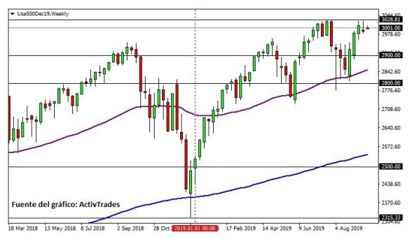 Es posible que estemos viendo las primeras señales de un ciclo de recesión, pero en realidad el Dow Jones completa una ganancia anual del 15%, mientras que el S&P 500 ha subido un 19% durante este año y se mantiene muy cerca de máximos históricos como podemos apreciar sobre el gráfico semanal, cortesía del broker de Forex y CFDs ActivTrades. Sin embargo, para que se mantenga la tendencia alcista en el S&P 500, el índice debería de romper por encima de los 3.028 puntos. Por otro lado, un retroceso a los 2.900 puntos es posible, de no llegar a superar la zona actual.