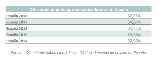 También en todos los casos, el francés el segundo idioma más solicitado (10,1% en las ofertas de directivos, 9,2% en las de mandos intermedios, 10,2% en las de técnicos y 13,5% en las de los empleados) y el alemán el tercero (4,4% en las ofertas de directivos, 6,8% en las de mandos intermedios, 5,4% en las de técnicos y 7% en las de los empleados).
