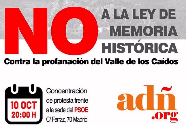 Por lo tanto, ante tanta insidia, tanto sectarismo y tanta traición, la coalición ADÑ alza la voz y anuncia su oposición frontal tanto a la profanación del Valle de los Caídos, como a la continuidad de la nefasta ley de Memoria Histórica de la que exige su derogación, y convoca a los españoles de bien que den un paso al frente para detener estas acciones tan injustas y sectarias como perjudiciales para la convivencia nacional. Para ello, y como primer paso, convoca una concentración de protesta el próximo jueves 10 de octubre a las 20h frente a la sede nacional del PSOE (Calle Ferraz, número 70 de Madrid) contra la Ley de Memoria Histórica y la profanación del Valle de los Caídos, acto público al que invita a todas las organizaciones patriotas y que compartan esta oposición y, por supuesto, a todos los españoles que hartos de injusticias y mentiras y huérfanos del amparo de instituciones cómplices de estas situaciones, se niegan a ser observadores pasivos de tanta ignominia.