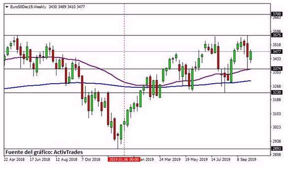 El índice del Europe Stoxx 50 rebota al alza después de haber encontrado un soporte en el EMA de 55 semanas, alrededor de los 3.374 puntos. Sobre el gráfico semanal del Europe Stoxx 50, cortesía del broker de Forex y CFDs ActivTrades, también podemos observar que la zona de los 3.575 puntos ha actuado como resistencia. De llegar a romper el 3.575 al alza, su próxima resistencia podría ser la zona de los 3.700 puntos que es donde está el máximo anual del 2017 y el 2018.