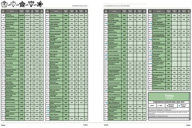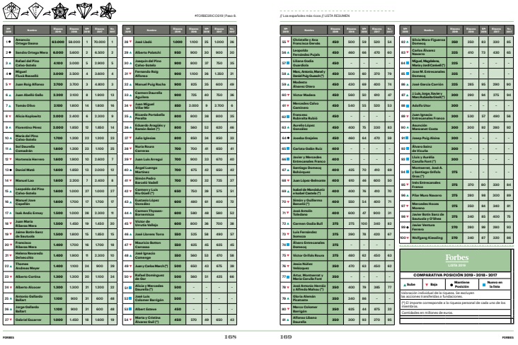 En cuanto a la división por géneros, la Lista Forbes 2019, incluye entre las cien fortunas de España a 26 mujeres, que acumulan una media de 900 millones de euros, con Sandra Ortega al frente. Alicia Koplowitz y María del Pino Calvo-Sotelo, octavo y décimo puesto de la lista con 2.000 y 1.700 millones de euros, completan el top tres.