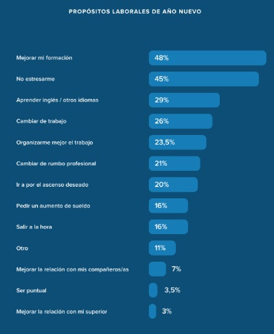 En concreto, Mejorar la formación (48%) - con algún curso de reciclaje o de nuevas herramientas - ocupa la primera posición del ranking, seguido del No estresarse (45%) y Aprender inglés u otros idiomas (29%). Cabe señalar, a su vez, que el 26% de los encuestados también tiene como propósito para el nuevo año Cambiar de empleo y el 23,5%, Organizarse mejor en el trabajo.