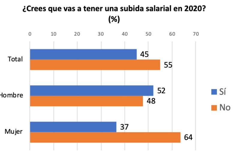 De acuerdo con el estudio elaborado por Infojobs, el 57% de la población ocupada española que cree que va a tener una subida salarial en 2020, considera que dicha subida salarial no será superior a la percibida en 2019. Una opinión unánime en ambos sexos. Por edades, la tendencia se invierte, a más joven más optimismo a que el incremento será superior en 2020. Un 56% de los jóvenes de entre 16 y 29 años cree que el aumento percibido en 2020 será superior respecto al obtenido el año anterior, frente al 33% de los mayores de 54% que así lo cree.