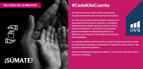 OVB Allfinanz España, la filial española del líder europeo en consultoría financiera, celebra un año histórico con acciones comprometidas con el entorno que le rodea. Por ello, ha puesto en marcha la acción “Cada Kilo Cuenta” junto a Banco de Alimentos donde consultores, partners y clientes podrán donar alimentos no perecederos en sus oficinas hasta final de febrero.