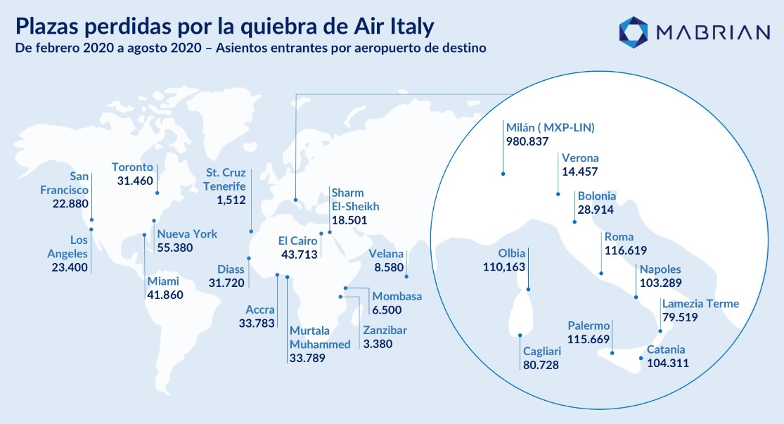La conectividad doméstica en Italia será la más afectada por la pérdida repentina de plazas. Los aeropuertos que pierden más plazas son los de Milán (959.000 pl.), Roma (117.000 pl.), Palermo (116.000 pl.), Olbia, Costa Smeranda (110.000pl.) y Catania (104.000 pl.). A nivel internacional, las conexiones con África son las más afectadas, perdiendo un total de más de 171.000 plazas hasta final de agosto. Destacan los destinos como Egipto, que pierde más de 62.000 plazas entre El Cairo (CAI) y Sham El Sheikh (SSH).