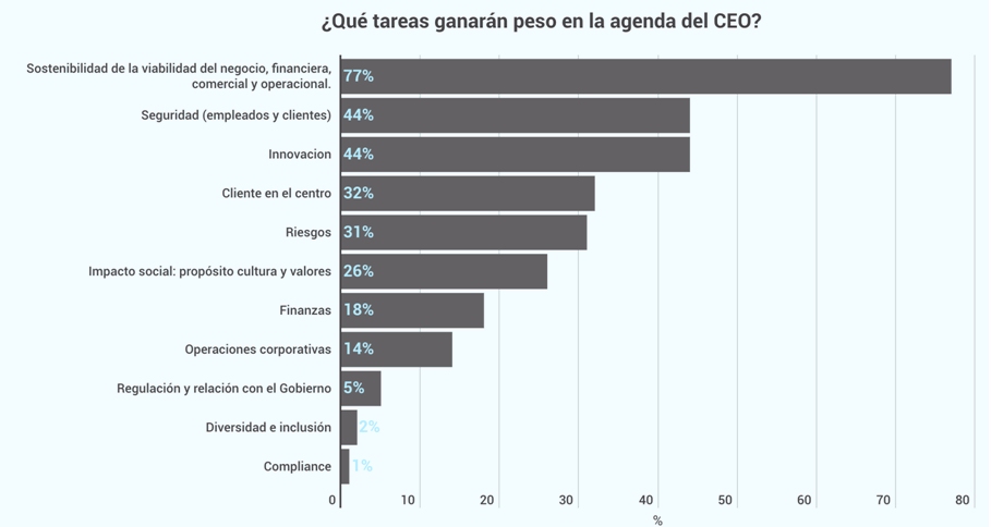Las tareas que ganarán peso en la agenda del CEO durante los próximos meses serán la sostenibilidad y viabilidad del negocio desde el punto de vista financiero, comercial y operacional, La seguridad de los empleados y clientes, y por último la innovación.