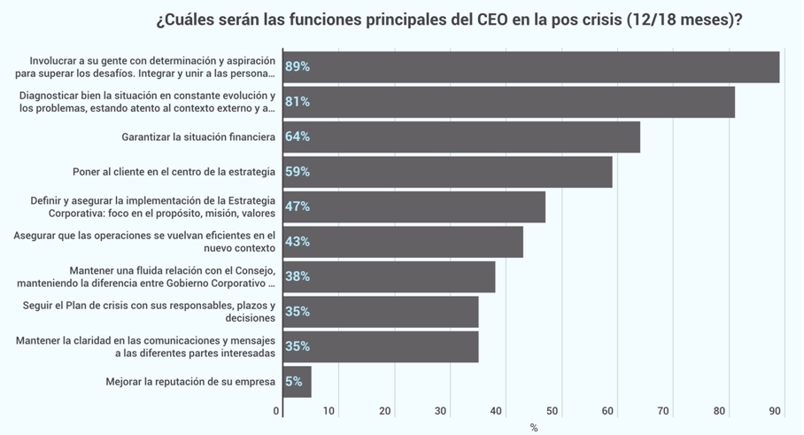 Por otro lado, se han puesto de manifiesto las funciones que ganarán peso en la labor de los CEOs en los próximos 12-18 meses en las que han destacado funciones como integrar, involucrar y unir a las personas; también diagnosticar la evolución de la situación y los problemas asociados y por último garantizar la situación financiera de la empresa. Asimismo las funciones que perderán importancia relativa son la mejora de la reputación de la empresas, claridad en las comunicaciones y seguimiento del plan de crisis con sus responsables, plazos y decisiones.