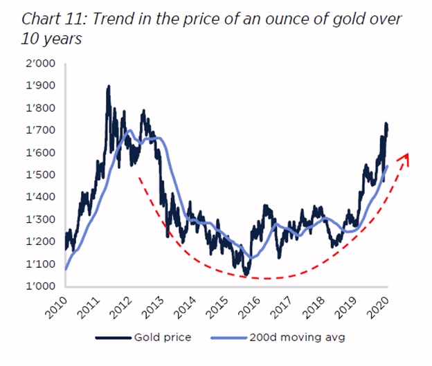 Históricamente, el oro ha estado sujeto a largos periodos de calma interrumpidos por excepcionales períodos de buen desempeño. Los períodos inflacionarios de los años 70 dieron lugar a una fiebre del oro seguida de un largo período de inactividad del metal amarillo, culminando en una larga fase de recuperación del ciclo de las materias primas en los años 2000. La pregunta es si la flexibilización monetaria de los principales bancos centrales - 13 billones de dólares - impulsará un nuevo sistema con tendencia alcista. En cualquier caso, en vista de las cantidades involucradas, esta es una suposición que no debe ser descartada.
