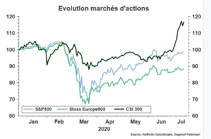 A nivel sectorial, las acciones de tecnología o los sectores catalogados como de crecimiento siguen superando a las acciones cíclicas. En Estados Unidos, el índice NASDAQ marcó nuevos récords la semana pasada. Esto no debe considerarse necesariamente como un sentimiento excesivamente optimista de los inversores en relación con la recuperación de la actividad económica en general (de hecho, los precios del oro alcanzaron su nivel más alto desde 2011), si bien, una recuperación generalizada de la economía beneficiaría a las empresas cíclicas. Geográficamente, el rendimiento del mercado de valores chino ha sido notable. El índice CSI300 subió un 20% en menos de un mes. Las últimas cifras económicas son realmente esperanzadoras, pero el aumento se debe principalmente a los medios de comunicación (públicos), que han estado alabando los mercados de valores. Ha habido un aumento de inversores individuales que compran acciones a crédito, lo que nos recuerda a las subidas de 2015.