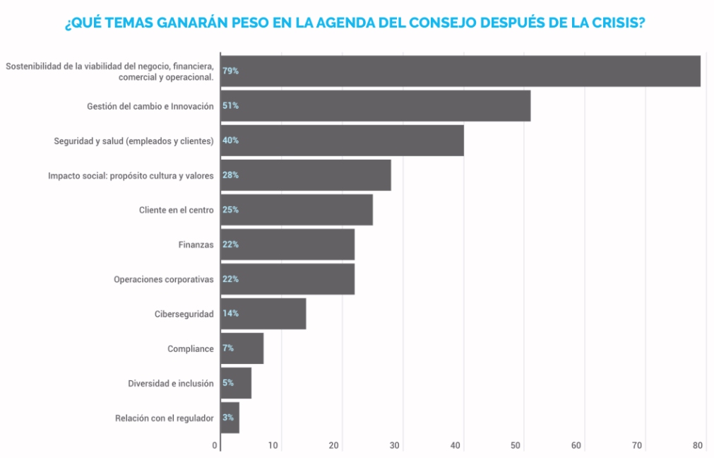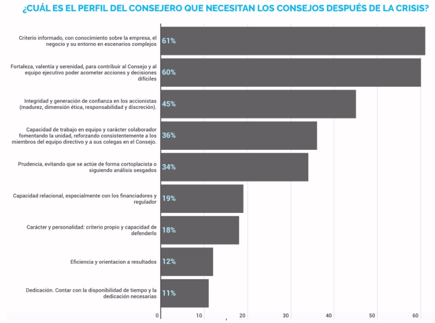 Algunos de los datos clave se resumen en que solo el 16% de los consejos tenían un plan de contingencia para afrontar la crisis del COVID, que solo un 35% de los consejeros evalúan la reacción del Consejo ante la crisis del Covid-19 como muy buena y que el género queda relegado a la tercera posición para mejorar en diversidad frente a las capacidades, nacionalidad o experiencia internacional.