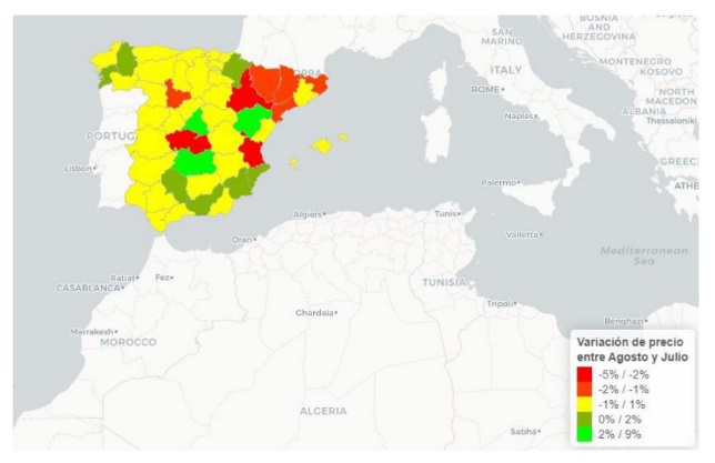 En cuanto al precio, la provincia con una mayor caída en el precio de oferta en agosto ha sido Teruel, con una disminución del (-13%), seguida de Ciudad Real (-12%) y las provincias de Guadalajara, Cuenca, Castellón y Almería (todas ellas un -10%).