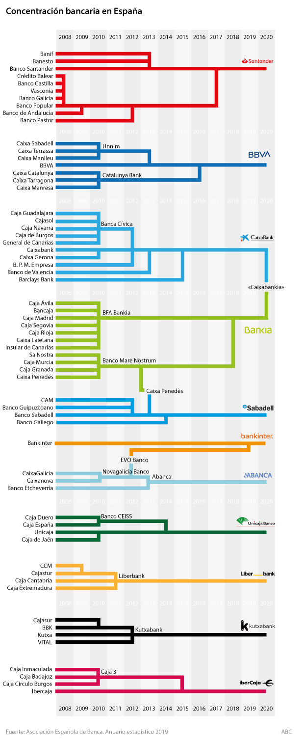 En 2010, momento en el que existían 45 cajas de ahorros, se inició un proceso de concentración y reestructuración del sector. Con la excepción de dos, el resto de las cajas desapareció o se transformaron en fundaciones de distinto tipo. Desde Octubre de 2018 quedan 8 entidades bancarias (ABANCA, Bankia, Caixabank, Cajasur Banco, Ibercaja Banco, Kutxabank, Liberbank y Unicaja Banco) que surgieron tras el traspaso de la actividad financiera a entidades bancarias creadas para tal efecto.