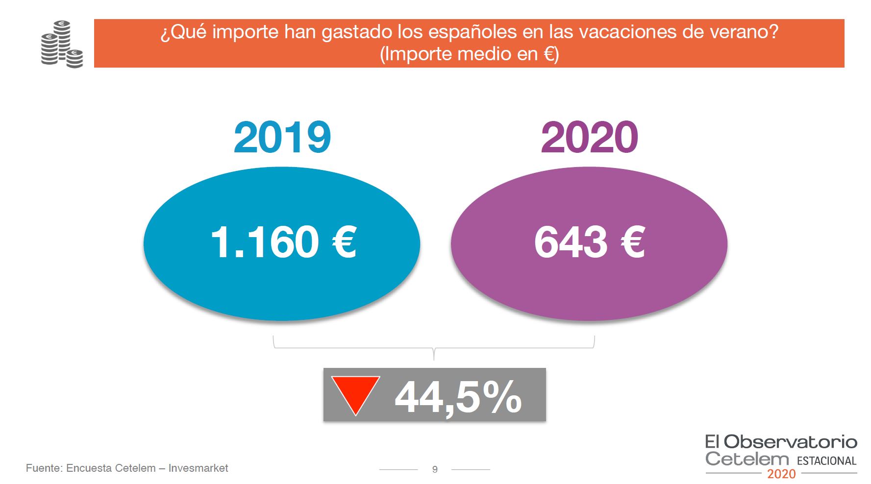 El gasto medio de los españoles en las vacaciones de verano ha sido de 643€ frente a los 1.160€ de 2019. Una caída del 45% que refleja una vez más el gran impacto de la pandemia en las fechas más señaladas del año para el descanso y el ocio. Esta es una de las conclusiones más significativas del estudio de El Observatorio Cetelem Estacional, dado hoy a conocer, en el que analiza el comportamiento de los consumidores españoles respecto al gasto realizado en las vacaciones de este verano.