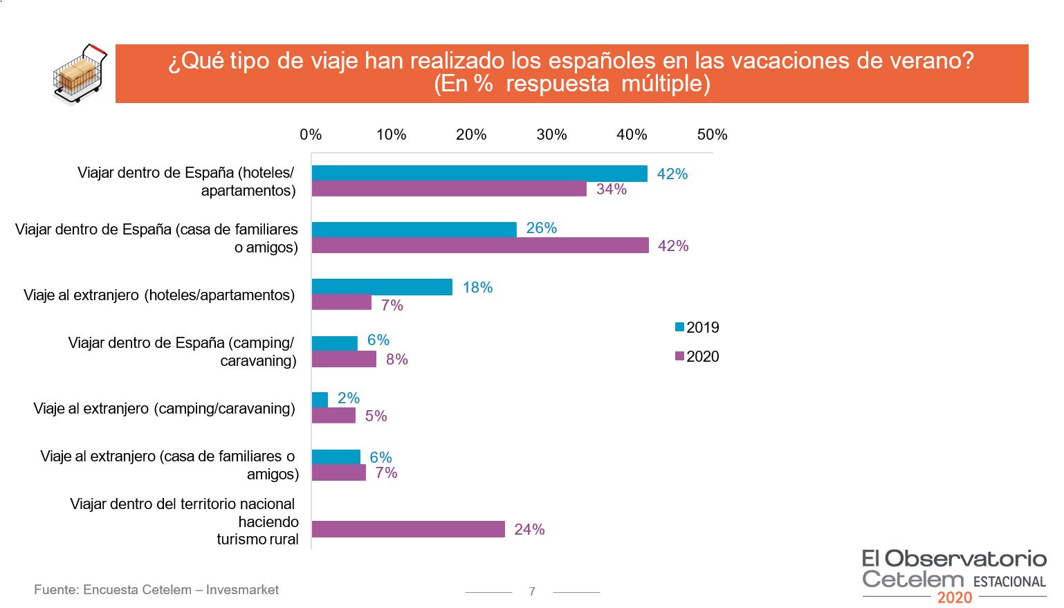 Durante estas atípicas vacaciones, el 42% de los españoles encuestados se ha alojado en casa de familiares o amigos (16 puntos más que en 2019). Del mismo modo, se observa una reducción de 8 puntos porcentuales en el porcentaje de españoles que declara haberse alojado en hoteles y apartamentos, mientras que los viajes al extranjero (con alojamientos en hoteles o apartamentos), también se han visto reducidos, pasando de un 18% en 2019 a un 7% en 2020.