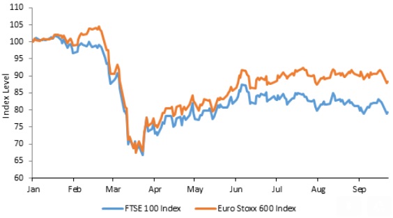 The ‘B’ word is back. It was not making headlines for most of this year because both parties involved the UK and Europe were embroiled in a more urgent crisis in the shape of a pandemic. The two sides are still making heated exchanges over Brexit negotiations while the 31st December 2020 deadline for agreeing the terms of their future relationship approaches quickly. Bad for Europe but worse for the UK, UK’s equity market has trailed Europe’s considerably this year. The UK’s FTSE 100 Index is down over 20% while Euro Stoxx 600 Index is down just over 11% year-to-date in sterling and euros respectively. If we compare the two in Euros, the UK fares even worse on account of Sterling’s weakness relative to the Euro another sign of the UK being hurt more by the risk of Brexit disruption and uncertainty.