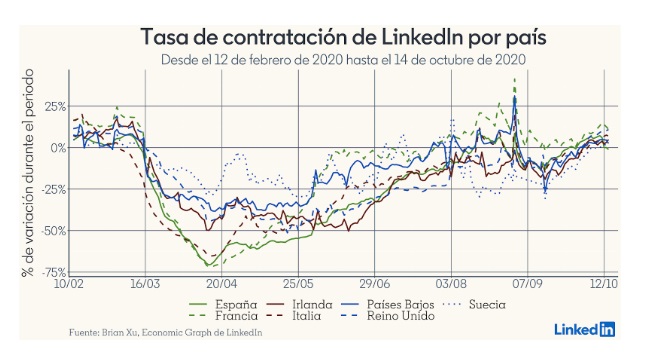 Los débiles vientos de cola de la recuperación del mercado laboral se estancan, según nuevos datos de LinkedIn, la mayor red social profesional del mundo. Los datos de 15 países, entre los que se incluye España, muestran que, si bien la contratación ha mejorado desde el primer impacto de la pandemia, la mayoría de los países no ha vuelto a un crecimiento constante del mercado laboral. Los datos de LinkedIn, que muestran el crecimiento de la contratación por países desde febrero hasta octubre de 2020, sugieren que evitar un confinamiento para preservar la economía no mejora el panorama de la contratación nacional a largo plazo, con Suecia detrás de otros países europeos. Brasil experimentó una de las caídas más pronunciadas en el reclutamiento a nivel mundial, mientras que la tasa de contratación de España está por detrás de otros países europeos. Por su parte, Francia está mostrando una de las recuperaciones más consistentes de estos 15 países analizados, a pesar de haber implementado medidas de contención.