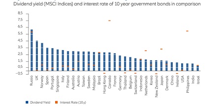 A pesar de la caída, los dividendos en Europa continuaron contribuyendo sustancialmente a la rentabilidad de la renta variable en 2020. Como resultado de esta reducción, la rentabilidad por dividendo en Europa se redujo en aproximadamente un punto porcentual en comparación con el año anterior, hasta aproximadamente un 2,75% en la segunda mitad del año pasado. Sin embargo, todavía está muy por encima de los rendimientos nominales de muchos valores del mercado de bonos. Los bonos alemanes a 10 años, por ejemplo, mostraron un rendimiento ligeramente negativo durante todo el año pasado.