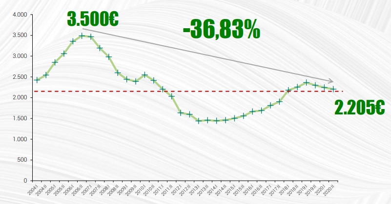 Paolo Boarini, Consejero Delegado del Grupo Tecnocasa, ha comentado que la cuota mensual de la hipoteca se sitúa en el segundo semestre de 2020 en 459€/mes, en línea con los semestres anteriores. Esta cuota contrasta con la alcanzada en el momento más alto, segundo semestre de 2007 (930€/mes).