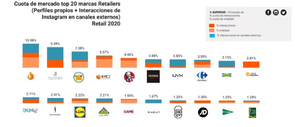 La red social preferida por las marcas de Retail sigue siendo Instagram, que lidera de forma destacada la generación de interacciones en este mercado (80,9%), seguida por Facebook (11,1%) y en tercera posición Twitter (7,6%), una red que resurge con fuerza especialmente por la apuesta de esta red por parte de algunas marcas, como KFC.