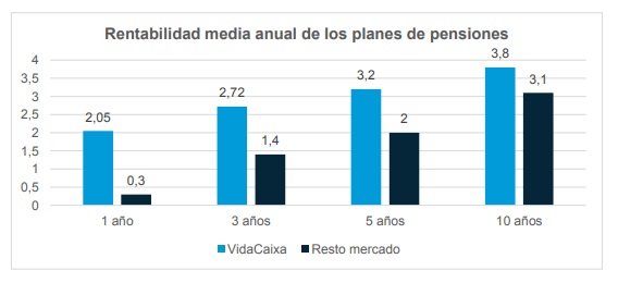 De hecho, los planes de pensiones de VidaCaixa registran una rentabilidad media anual del +3,2% a 5 años y del +3,8% a 10 años, frente al +2% y +3,1% respectivamente, del conjunto de planes de pensiones gestionados del sistema individual en España.