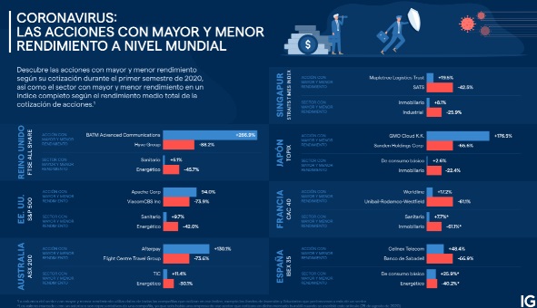 IG, el proveedor de trading en línea, ha revelado cómo ha afectado la COVID-19 al mercado de valores global hasta la fecha. Los datos, que se basan en el rendimiento de las acciones de la compañía en la primera mitad de 2020, nos revelan los valores y sectores con mayor y peor rendimiento en el Reino Unido, EE. UU., Australia, Japón, Singapur, Francia y España. Los datos ponen de manifiesto que, aunque hay una división global, hay sectores como el sanitario o el de artículos básicos de consumo que han experimentado un aumento visible. No obstante, no ha habido gran conmoción en el ámbito de los economistas, puesto que históricamente estos sectores suelen ser los de mayor rendimiento en tiempos de crisis.