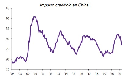 Impulso crediticio en China de apoyo pero recientemente ha caído. Como resultado, es probable que la demanda china, tanto interna como de bienes internacionales, se modere en los próximos meses.
