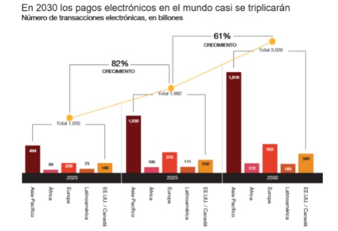 Por áreas geográficas, Asia-Pacífico será la región que liderará este crecimiento, con incrementos del 109%, hasta 2025, y del 76%, entre 2025 y 2030, seguida de África (78%/64) y de Europa (64%/39%). Estados Unidos y Canadá será la región donde el aumento será más moderado (43%/35%). Esto significa que el número de transacciones per cápita prácticamente triplicará el nivel actual en el conjunto del planeta. En Asia, por ejemplo, el fuerte crecimiento de los pagos electrónicos se está viendo alimentado por la innovación y por la puesta en marcha de nuevos modelos de negocio. En China, Alipay y WeChat Pay, propiedad de dos gigantes del comercio electrónico como Ant Group y Tencent, han creado un nuevo paradigma con el lanzamiento de super aplicaciones que funcionan como plataformas de pago.