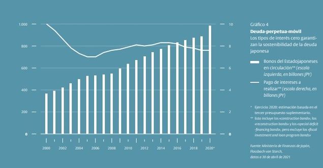 Japón sigue yendo un paso más allá que otros países: Desde el año 2000, las nuevas emisiones de bonos del Estado han representado al menos el 30% de los ingresos públicos de cada año, una cantidad muy superior a la necesaria para el servicio de la deuda. Debido a la pandemia, la emisión de bonos en el año fiscal 2020 (del 1 de abril de 2020 al 31 de marzo de 2021) supuso en realidad más del 60%.