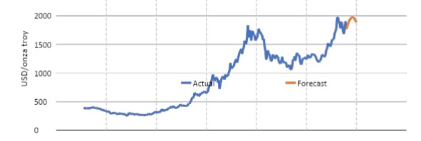 Utilizando nuestro marco de modelo, explicado en nuestro blog del “Oro: cómo valoramos al metal precioso”, realizamos una proyección del precio del oro hasta el segundo trimestre de 2022. Asimismo, estas perspectivas incorporan la visión del consenso de mercado sobre la evolución prevista de las variables macroeconómicas extraída de la encuesta a economistas realizada por Bloomberg en 2021.