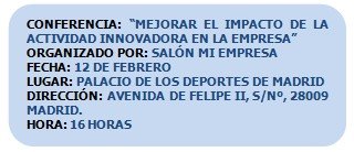 La Conferencia, que tendrá lugar en la sala “Desarrollo y Consolidación” del Palacio de los Deportes de Madrid, el martes 12 de febrero a las 16 h., abordará desde: cómo mejorar el impacto de invertir en innovación en la cuenta de resultados y de cómo optimizar este gasto; las oportunidades existentes en el contexto económico actual; cómo afecta la innovación y la sostenibilidad en los indicadores clave de desempeño, y por último, identificar qué tipo de empresa somos y cómo financiar la innovación. La Conferencia es de acceso gratuito y basta con registrarse a través del siguiente link: