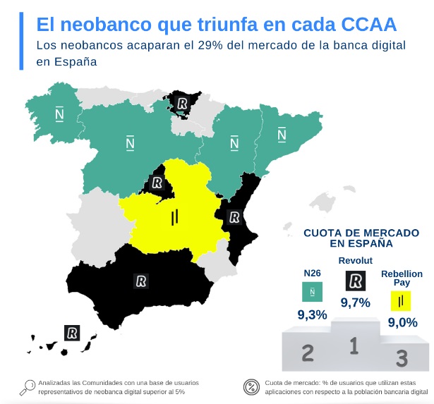 Evaluando este crecimiento de forma individual, Revolut, la compañía de origen británico, es quien acapara la mayor cuota de mercado en 2021 (10%), seguida de N26 (9,3%), Rebellion Pay (9%) y Bnext (4,8%). Sin embargo, la española Rebellion Pay destaca sobremanera con un crecimiento del 172% entre 2019 y 2021, seguida de N26 (102%), Revolut (76%) y Bnext, la única de las analizadas que pierde un 48% cuota de mercado respecto a 2019.