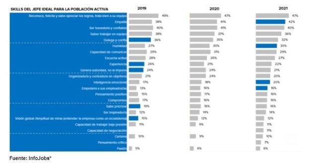La pandemia ha supuesto muchos cambios y constantes retos para las compañías que, con el fin de adaptarse a la nueva realidad, han tenido que desempeñar e implementar soluciones que permitieran el correcto funcionamiento de su actividad con los menores perjuicios posibles. Y, en este sentido, la transformación digital y el papel de los nuevos líderes siguen jugando un papel fundamental en la gestión del talento que, sin lugar a dudas, es uno de los mayores activos dentro de una organización. InfoJobs, plataforma líder en empleo en España, ha llevado a cabo un estudio para analizar qué cualidades debería tener el jefe o líder ideal, según la población activa española. Los resultados confirman que la skill más valorada sigue siendo, para un 47% de los españoles, saber reconocer, felicitar y apreciar los logros, además de tratar bien al equipo. Sin embargo, si comparamos los resultados de este 2021 con años anteriores, los atributos directamente relacionados con la inteligencia emocional son cada vez más importantes en un jefe ideal por parte de los empleados. En el último año, las cualidades que más han crecido en este sentido son la empatía, la humildad, la capacidad de comunicar y la escucha activa, que son las más valoradas para el 42% de los empleados españoles (+3,5 puntos porcentuales respecto a 2019).