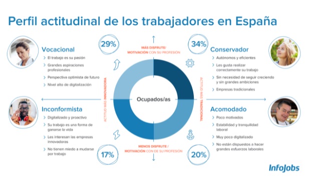 Se trata del segundo perfil con mayor porcentaje de trabajadores en España. Afirma estar constantemente formándose (88%) y reciclando sus conocimientos (reskilling). En su trabajo es una persona proactiva (83%), a la que le gusta proponer ideas y enfrentarse a los desafíos que se le presenten. Para dichos perfiles, el trabajo es su pasión (73%) y una forma de desarrollo profesional y crecimiento personal (70%). Por último, tiene claros sus objetivos profesionales y a lo que aspira (69%), y está dispuesto a esforzarse, trabajar duro y formarse para conseguirlo.